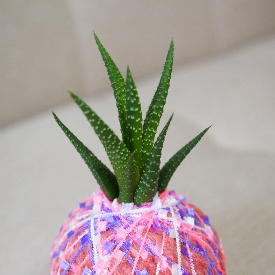 植物にカラフルな色の糸を合わせた新感覚のテーブルグリーンのインテリア