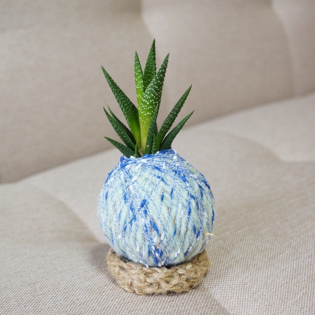 植物にカラフルな色の糸を合わせた新感覚のテーブルグリーンのインテリア