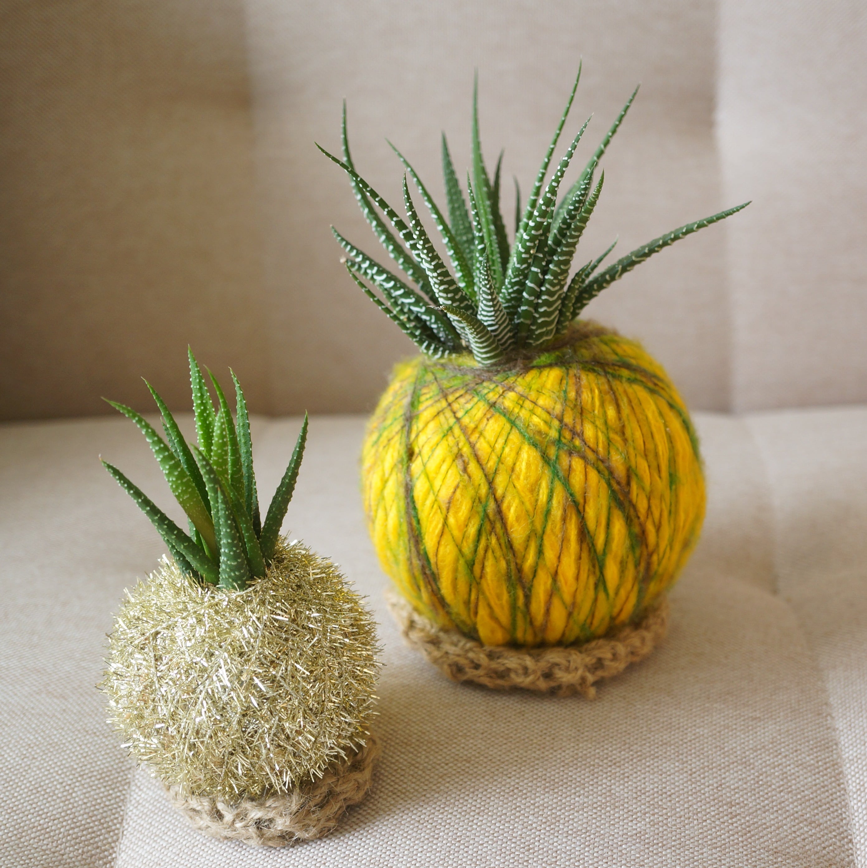 植物にカラフルな色の糸を合わせた新感覚のテーブルグリーンのインテリア